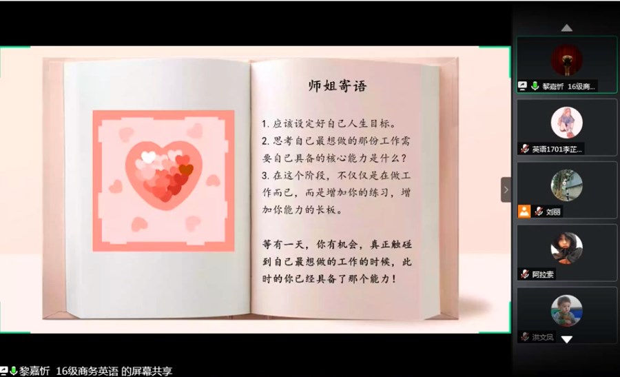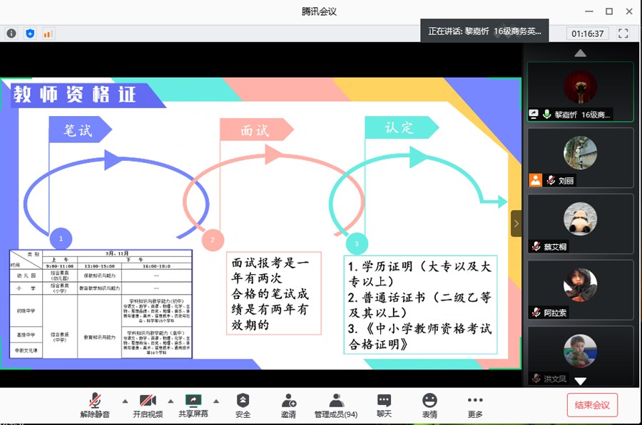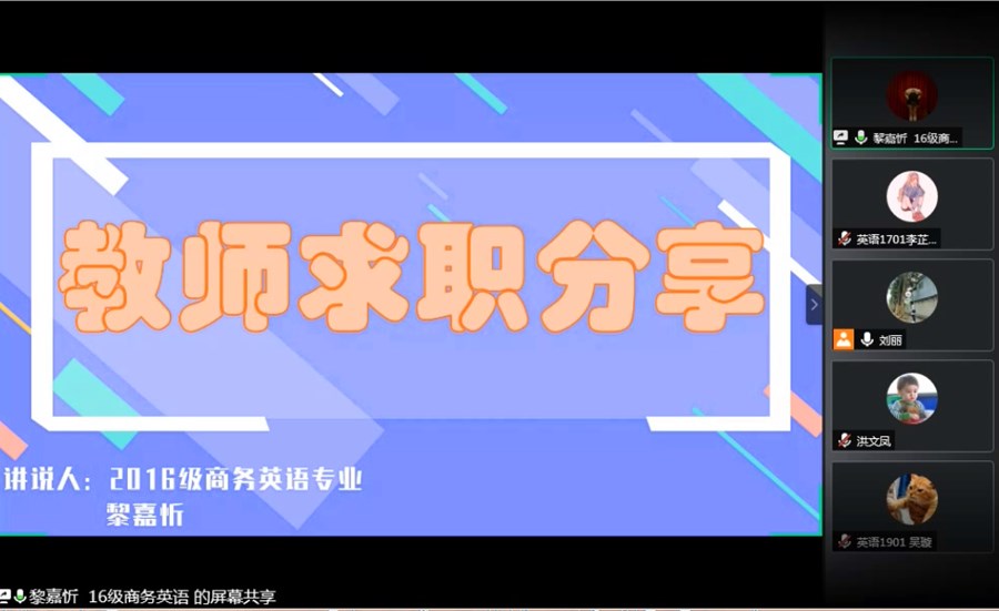 接下来是现任职凤鸣小学教师——16级商英专业的黎嘉忻同学。黎嘉忻同学以如今高校毕业生严峻的就业形势为切入点,讲述了2020年国家为应届毕业生制定的五个优惠政策。紧接着,她讲述了同学们所关心的关于考教师资格证的问题,为同学们答疑到底要不要考取教师资格证以及拿证的作用有哪些等问题,还详细介绍了报考教师资格证的步骤和考试流程。随后,她向同学们重点分享了对于教师职业就业的一些经验总结,她指出,首先是简历的制作要简洁大方、突出重点,在试讲环节要保持课程进程流畅以及教态自然等。她还分享了适用于新人教师的秘籍,如新老师入职以担任班主任为锻炼与考验,以及课前、课中和课后的工作建议等。最后,她提议同学们应设立好自己的人生目标,思考自己心仪工作所要求的核心能力,并在工作中不断提升自我。