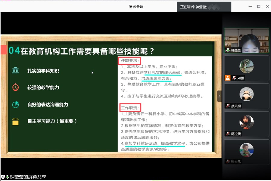 在疫情的影响下,2020年大学生就业形势相比往年更为严峻。为了帮助有教师就职意向的同学们朝着这个目标更加顺利地前进,澳门十大网投平台排行于6月23日晚上8点在腾讯会议召开求职就业分享会。本次分享会邀请到现任职星火教育辅导教师的钟莹莹同学以及现任职凤鸣小学教师的黎嘉忻师姐为同学们传授丰富经验。学院党总支书记徐超及17级、18级、19级的学生参加了此次就业分享会,会议由17级辅导员刘丽主持。