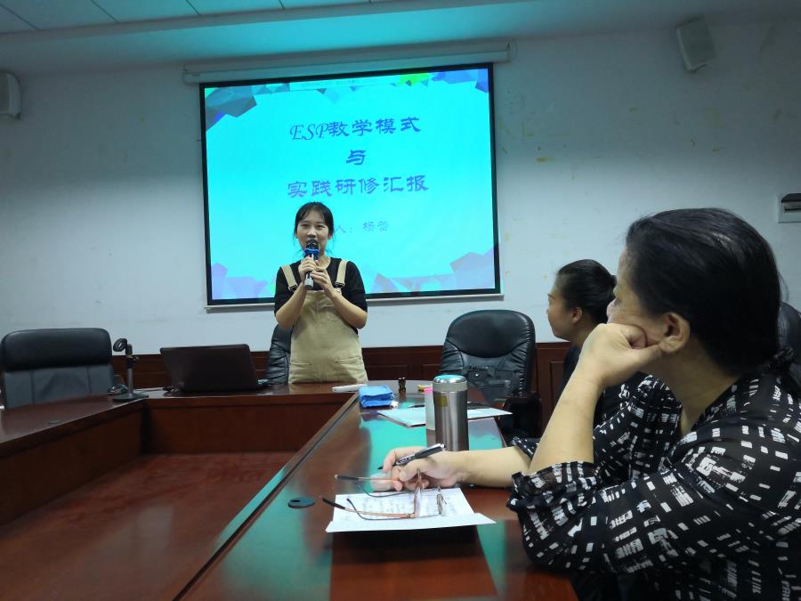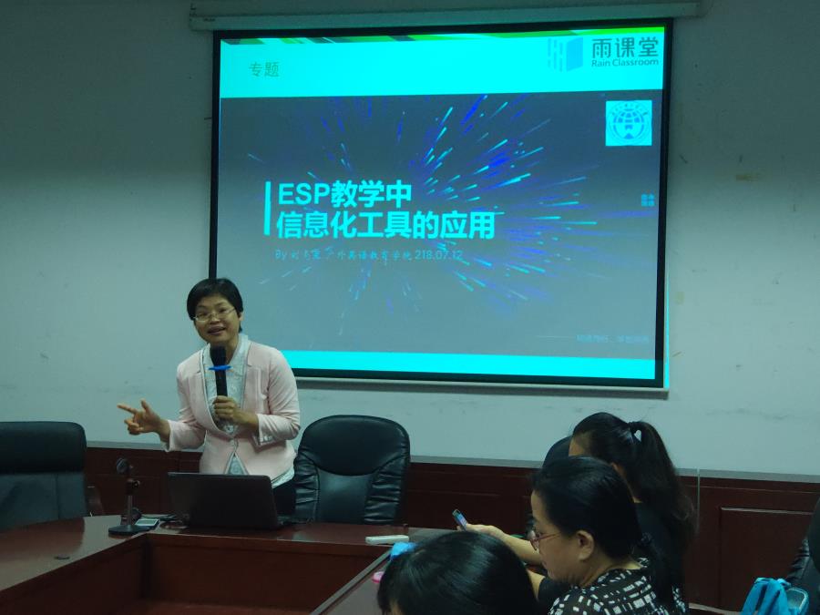 工作坊的重头戏,是外出学习教师反馈学习心得并传递大学英语研究前沿动态。吴佩娟与杨蕾一方面介绍了专门用途英语教学的研究现状及趋势,另一方面结合信息化教学平台---“雨课堂”的教学实例,向老师们详细介绍了用“雨课堂”开展英语课内外教学的具体方法,还分享了实际教学中的感受。教师们跟随着两位主讲老师的提示,拿出手机扫描进入小程序,现场感受了一个特别的教学课堂。
