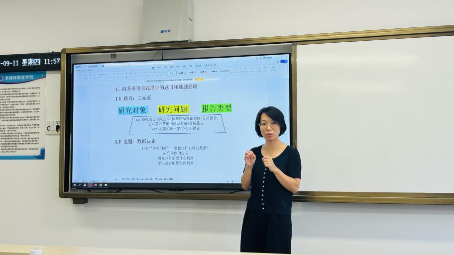 为提升教师对商务英语实践报告的指导能力,明确实践报告撰写重点与难点,9月11日中午,澳门十大网投平台排行商务英语系于第九教学楼414教室开展“商务英语实践报告指导”专题工作坊。本次工作坊由李望华主任主持,陈雪珍副教授主讲,多位指导商英实践报告的教师积极参与。