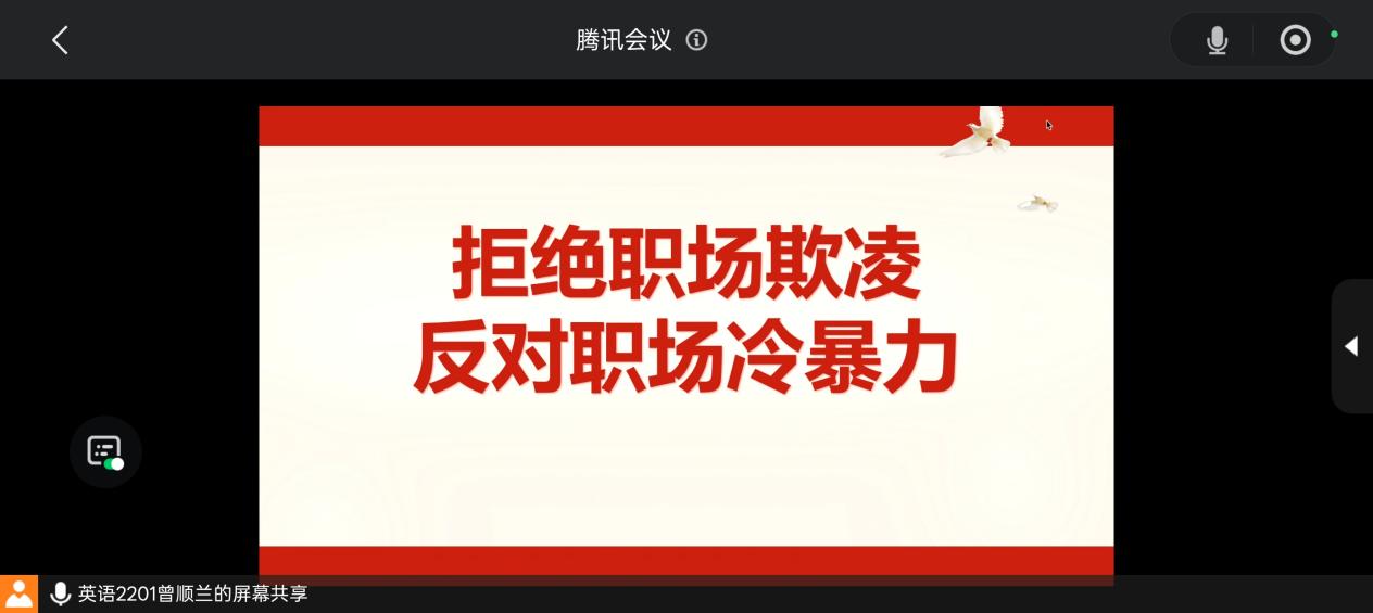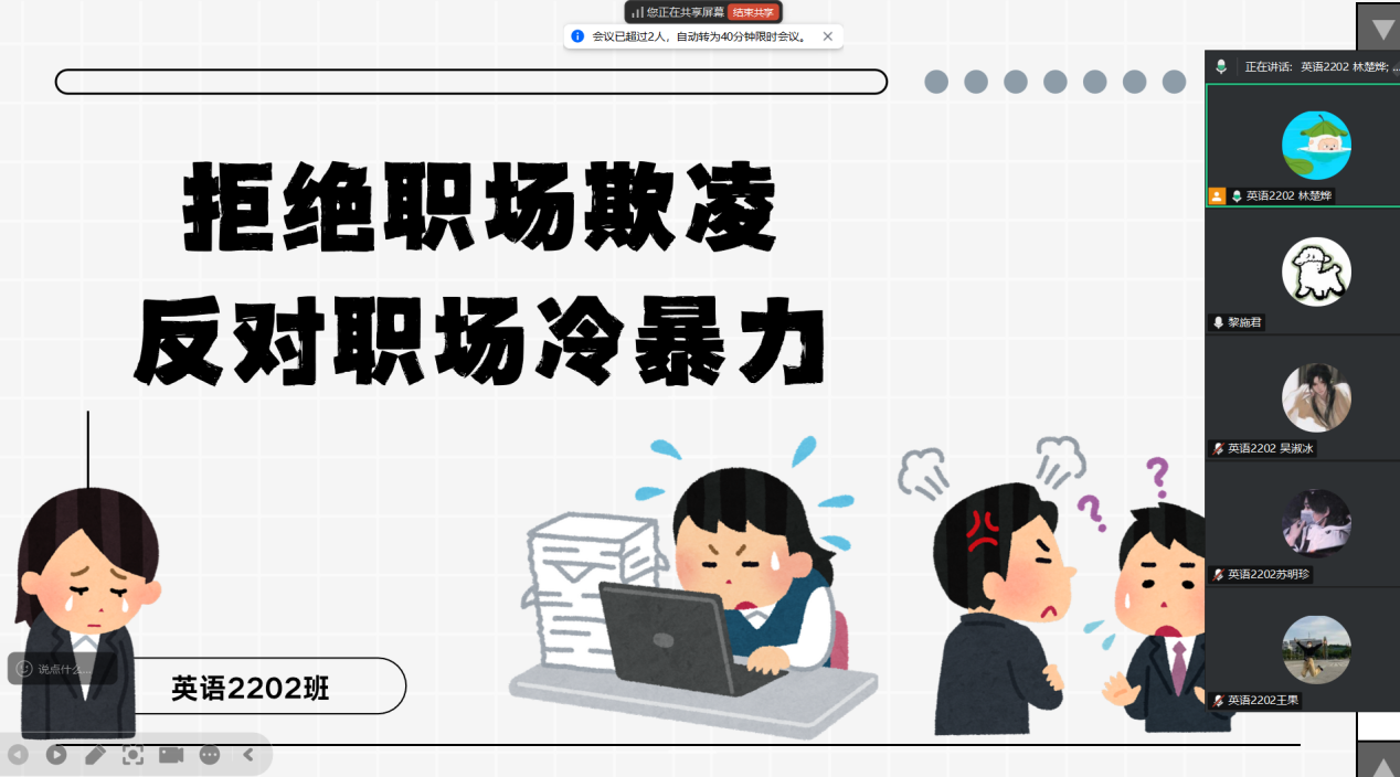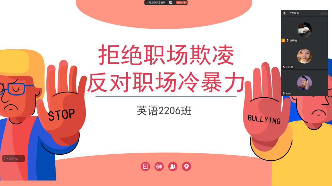 为营造和谐、尊重的职场生态,增强职场人及准职场群体对职场欺凌与冷暴力的认知能力、防范意识和应对技巧,11月1-15日,澳门十大网投平台排行22级英语专业各班级组织开展了“拒绝职场欺凌、反对职场冷暴力”主题线上班会活动。本次班会由各班级团支书主持,全班同学参与。