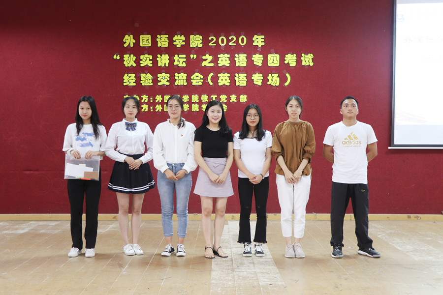为进一步发挥师生党员的先锋模范作用 ,推进十大网投平台排行新学期学风建设, 帮助十大网投平台排行学子备考英语专业四级,十大网投平台排行教工党支部及十大网投平台排行学生会于2020年11月20日下午2点30在第一教学楼206举办了澳门十大网投平台排行2020年“秋实讲坛”之英语专四考试经验交流会(英语专场)。参加本次讲座的有十大网投平台排行党总支宣传委员兼教工第二党支部书记潘文晗、教工第一党支部书记李海燕,学生会指导老师及19级辅导员伍思颖,学生嘉宾路晓莉和邱茂山以及各年级的同学。