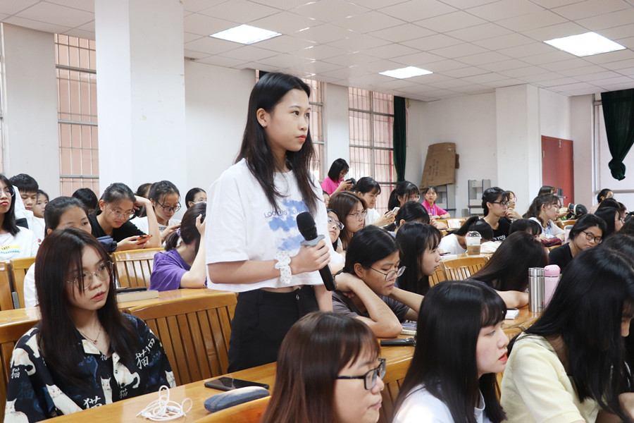 学生嘉宾路晓莉和邱茂山依次分享学习经验。路晓莉主要介绍了听力和写作两个方面,她倾囊相授,如数家珍,向同学们详细讲解了两种题型的答题技巧以及考试时心态的重要性以及填涂答题卡时的注意事项等。邱茂山则以幽默风趣的语言向大家介绍查字典的“正确打开方式”,完形填空和阅读理解的答题技巧。通过讲解真题,他详细地介绍了答题步骤和答题策略,此外,他还通过个人经历告诉同学们备考过程中劳逸结合的重要性。