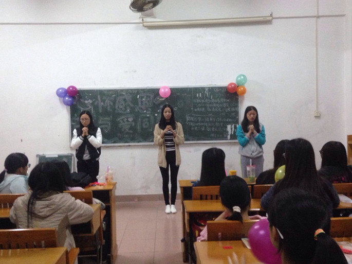 为了让同学们学会用实际行动去践行感恩,外语系15级英语2班于2015年11月26日感恩节这天在C202教室迎来了第二次班会活动。