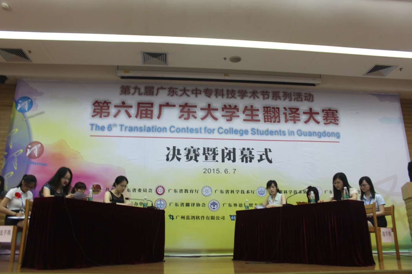 广东省大学生翻译大赛的主办单位为团省委、教育厅等五家单位,是广东省高校间历史最悠久、影响最广泛、水平最高的翻译赛事,每年均吸引全省所有高校报名参赛。该项赛事分为本科组、高职高专组两个组别,每个组别开设英语口译、英语笔译、日语口译、日语笔译四项比赛。
