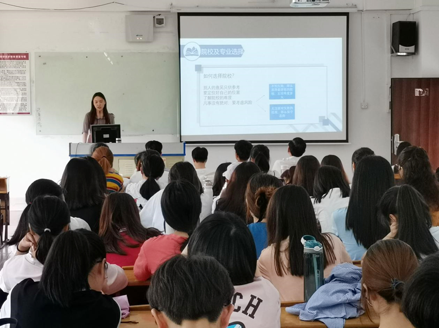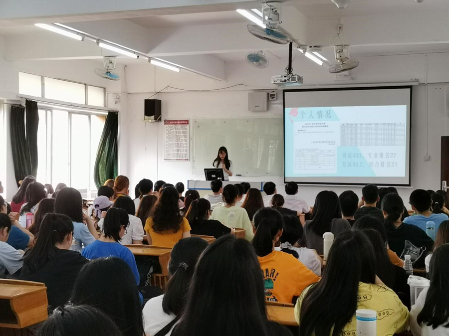 陈喜佳从研究生院校选择、报名备考、笔试面试等环节向同学们分享了自己的考研心路历程。她特别提出,考研院校选择十分重要,既要了解报考院校难度,也要做好自身能力定位,只有“量身定制”考研目标,才能下定决心一举成功。甄嘉颖分享了自己的报考初心——成为一名英语口译人才。她从准备资料、规划时间、调整心态等几个方面分享了自己考取研究生的成功经验。她说,考研之路非常辛苦,在遇到挫折时要学会自勉、劳逸结合,如此以来才能事半功倍。互动环节,同学们就自己关心的考研话题、图书馆自习时间等与2位师姐进行互动,师姐们结合自己的考研心路历程,给予了详细的答复。