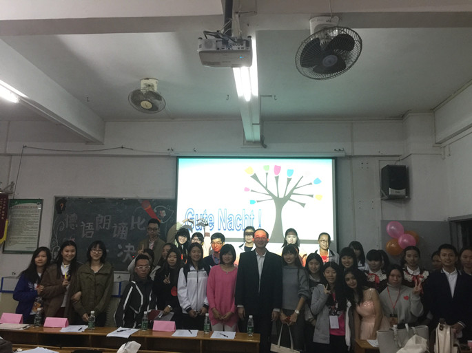 2015年11月29日晚,由德语协会主办的的第五届德语朗诵比赛在教学楼B104隆重举行。外语系党支部徐超书记、2015级辅导员林蔚老师出席本次比赛,另外王静尧老师、优秀学生代表杨信仪和邹嘉琪担任比赛评委。