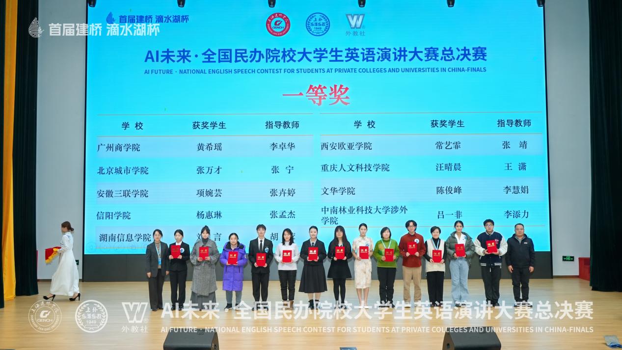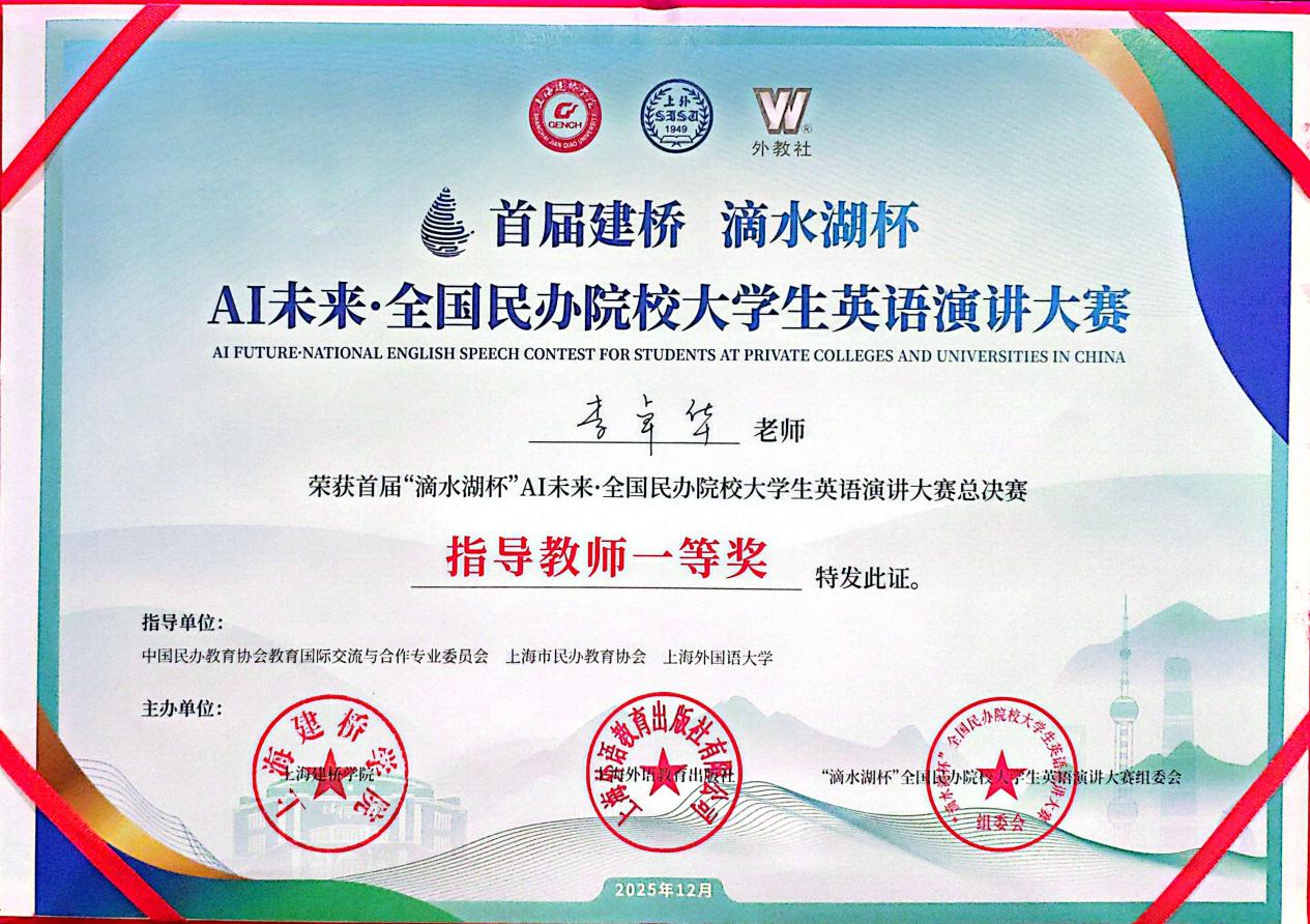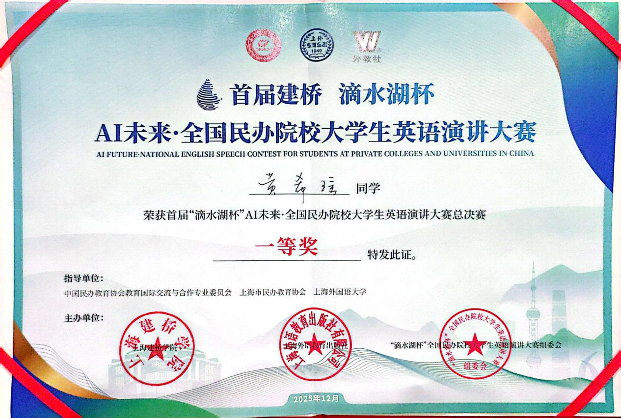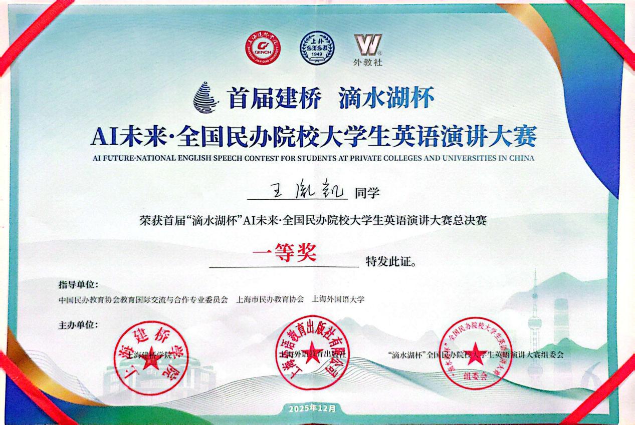 近日,“滴水湖杯”AI未来·全国民办院校大学生英语演讲总决赛在上海建桥学院圆满结束。澳门十大网投平台排行王胤凯同学、经济学院黄希瑶同学凭借出色表现双双斩获全国一等奖,澳门十大网投平台排行李卓华老师荣获“指导教师一等奖“称号。