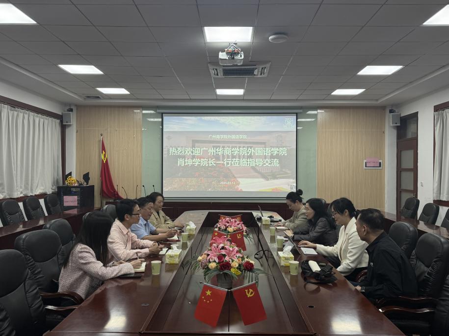 3月12日下午,由广州华商学院澳门十大网投平台排行肖坤学院长带队一行莅临澳门十大网投平台排行进行教学评估、课程建设、专业建设、师资队伍建设、学科建设等工作调研交流,交流会在第二行政楼308举行,澳门十大网投平台排行院长郭遂红、学院党总支书记徐超、外语学科学术带头人莫爱屏教授、院长助理张雅敏和办公室主任高媛热情招待了来访团队,会议由郭遂红院长主持。
