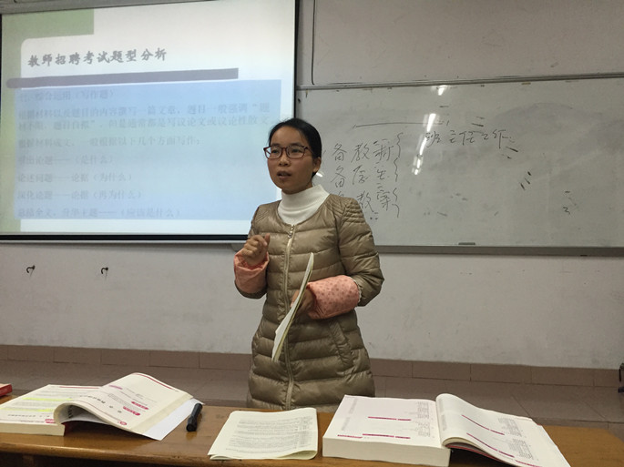 本次师范技能培训对教师资格和招聘考试知识讲解,虽然不能面面俱到,但是为我系有意愿从事教师行业的16届毕业生指明了复习的方向,让他们在摸索站上三尺讲台的路上再迈进了一步。