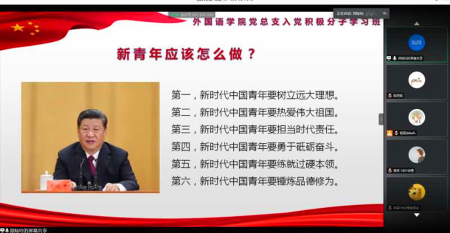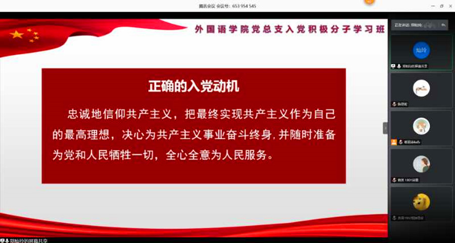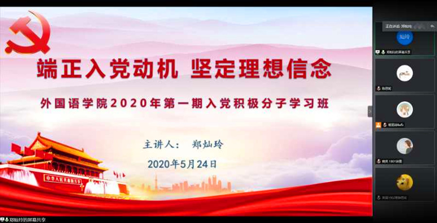 为进一步深入落实“端正入党动机,坚定理想信念”主题教育工作,扎实推进入党积极分子的学习教育工作,5月24日晚19:00,澳门十大网投平台排行分党校2020年第一期入党积极分子第三次党课培训于线上顺利开展。此次党课由澳门十大网投平台排行校团委副书记郑灿玲主讲,分党校助理教员李若薇同学主持,全体学员参加学习。