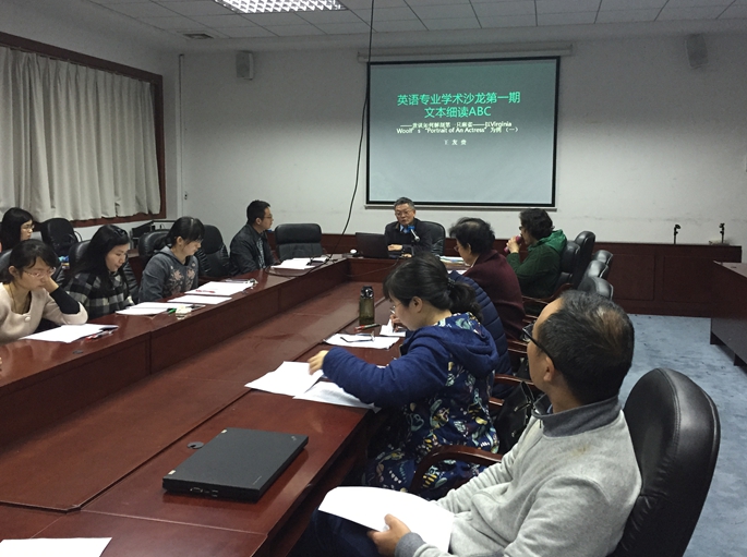 2016年3月24日下午,我系王友贵教授主讲英语专业学术沙龙(第一期)活动在第二行政楼308举行,本次活动的主题是“文本细读ABC,兼谈如何解剖一只麻雀--以Virginia Woolf’s ‘ Portrait of An Actress’为例” 此次沙龙讲座由我系副主任袁鑫主持,系主任马蔚兰教授以及外语系部分专任教师一起聆听了此次讲座。