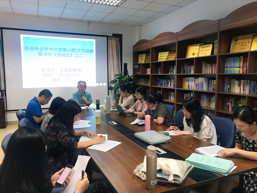 6月3日下午,澳门十大网投平台排行在第二行政楼307室举行了第26期英语专业学术沙龙,主题为“笛卡尔《方法论》文本细读之二”,王友贵教授主讲,副院长袁鑫和英语系部分老师参加了此次沙龙。