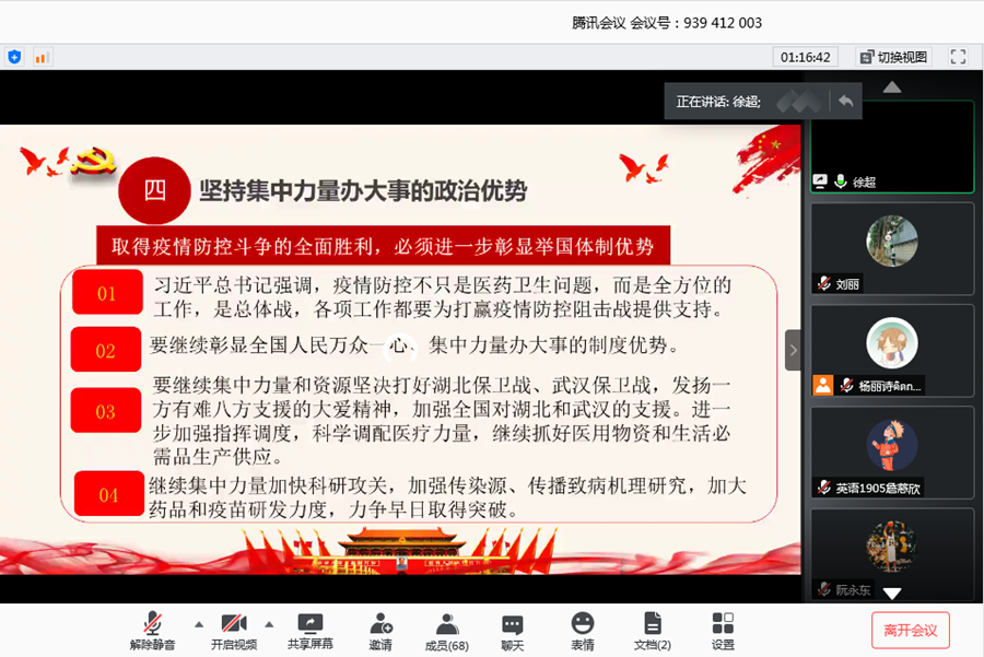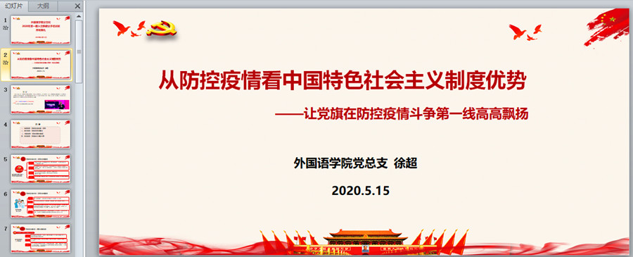 徐超紧紧围绕“从防控疫情看中国特色社会主义制度优势”开讲第一课。他从中国共产党的体制优势、组织优势、制度优势及政治优势四个方面全面讲解了中国特色社会主义制度的先进性和优越性,深刻阐述了中国共产党的领导在全民共同抗击疫情,坚决打赢疫情防控阻击战的重要性和必要性。他深度融合新时代思想和大学生生活实践,通过一个个鲜活的事例用深入浅出的方法向学员分析疫情当前大学生学习习近平总书记对“90后”党员的重要回信精神、勇担时代责任的现实做法,进一步倡导入党积极分子要热爱祖国、拥护中国共产党的领导、热爱社会主义,增强了入党积极分子对国家和人民的强烈责任感和勇于担当的精神。最后,徐超还要求学员们一定要树牢“四个意识”、坚定“四个自信”,坚决做到“两个维护”,让党旗在防控疫情斗争第一线高高飘扬。