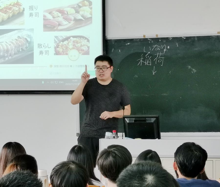 本次研讨课为18级日语专业郭志成老师主讲的专项实践课 “日本文化调研实践”,主题为“日本料理及饮食文化”。郭老师先向学生展示了很多日本的美食图片,再以提问的方式引入本次课堂调研的主题,结合饮食文化的内容对本次文化调研的方向及内容进行讲解。接下来,同学们分组展示了上一个主题的调研发表,郭老师进行逐一点评,指出里面的优点与不足,并提供了行之有效的调研方法供学生参考,为本次调研工作做好准备。在教学过程中,郭老师会穿插一些日本民间关于饮食方面的风俗,以加深学生对饮食文化的理解,从历史、地理、人文等角度探寻日本文化的内涵。郭老师语言风趣,教态自然,语言基本功扎实,课程设计完整流畅,教学环节紧凑,教学效果良好。