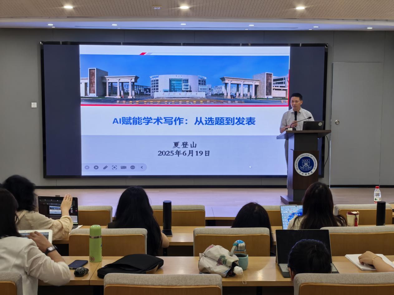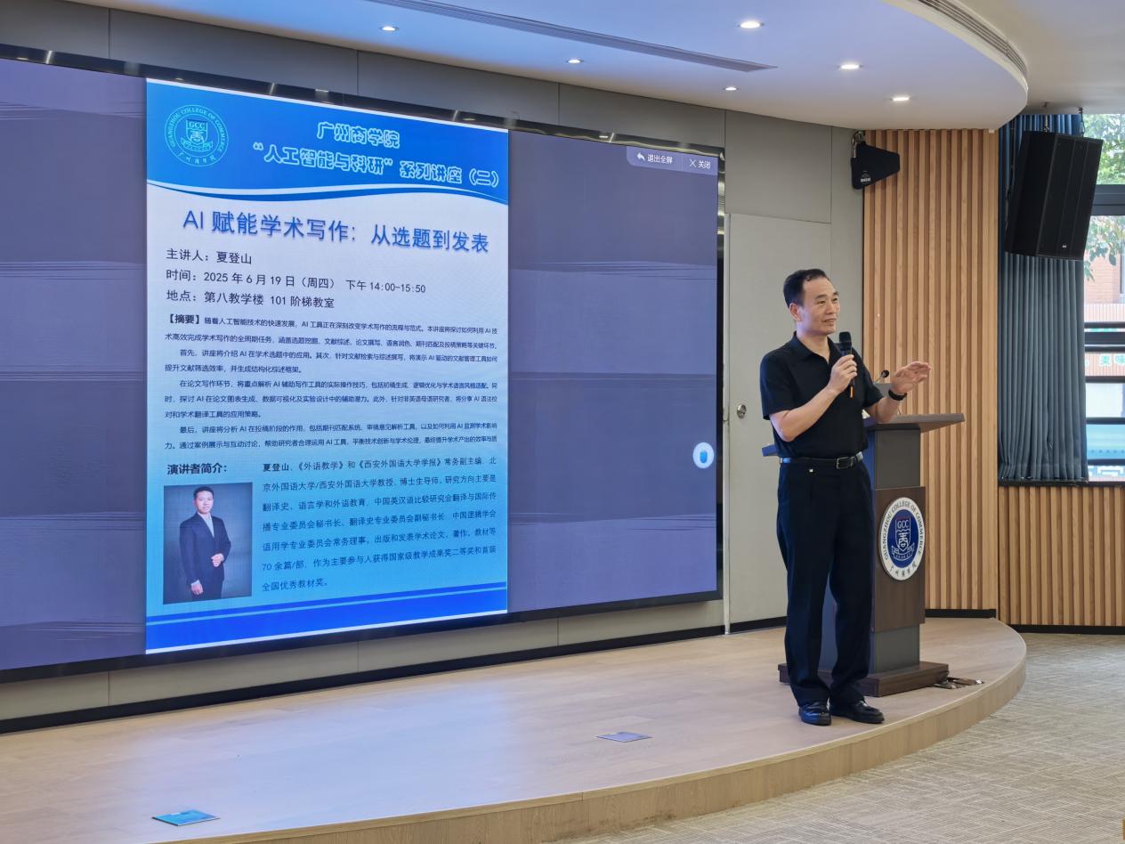 6月19日,澳门十大网投平台排行在第八教学楼101报告厅成功举办“AI 赋能学术写作:从选题到发表”主题讲座。本次讲座由外语学科带头人莫爱屏教授主持,北京外国语大学、西安外国语大学教授、博士生导师夏登山教授主讲,澳门十大网投平台排行和国际学院全体教师齐聚一堂,共同探索人工智能技术如何深度革新学术写作全流程。