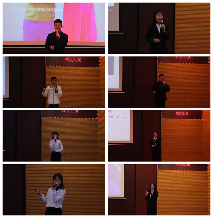 汇演初始,马院长作了开场发言,勉励学生们要勇于锻炼自己用英语和世界沟通的能力。九位来自2018级的学生代表分别在台上做了不同主题的演讲。他们的演讲话题涉及语言学习、女性自我意识觉醒、儿童权益保护、正确处理焦虑、熬夜、大学生理财等等与校园生活和社会生活息息相关的领域。学生代表们的演讲思辨性强、逻辑清晰、语言精彩、富有表现力,充分体现了当代青年大学生对生活的积极态度和对我们所生活的社会的积极关注。汇演中场互动环节播放了2018级同学平时的课堂演讲片段,将课堂带入舞台,将舞台融入课堂。