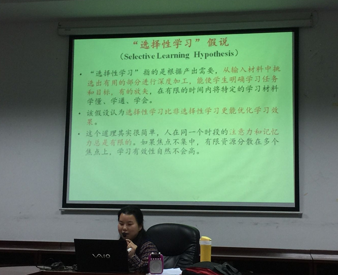 伍老师从国内的英语专业读写危机引入,国内外的学者提出不同的解决问题的方案,例如Swain的输出假说、王初明教授的“读后续写”以及文秋芳教授“产出导向教学体系”,但是其核心都是强调:输入和输出必须紧密结合,语言习得才真正有效。目前,湖南师范大学的陈敏哲教授为首,提出了“读议写”教学模式,而且建立了一个英语专业课程改革的教学团队,改革英语专业现有课程体系,建立“读议写“系列课程。伍老师总结当前的研究,提出“读—议—写—评”一体化教学模式,读“应采用精读泛读并举、质与量并重,以质带动量的增加,以量保证质的提高。”议“的组织方式要灵活多样,要搭建议论平台,增强相互交流意识。”写“时要鼓励学生调用知识图式,斟酌语法规则,推敲词语搭配,和掂量词句适切性。”评“应当体现以评促学的要求。让读、议、写融合贯穿于人文知识讲授中,并利用反思性学习促进语言技能和专业知识的共赢发展。