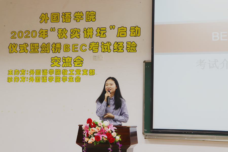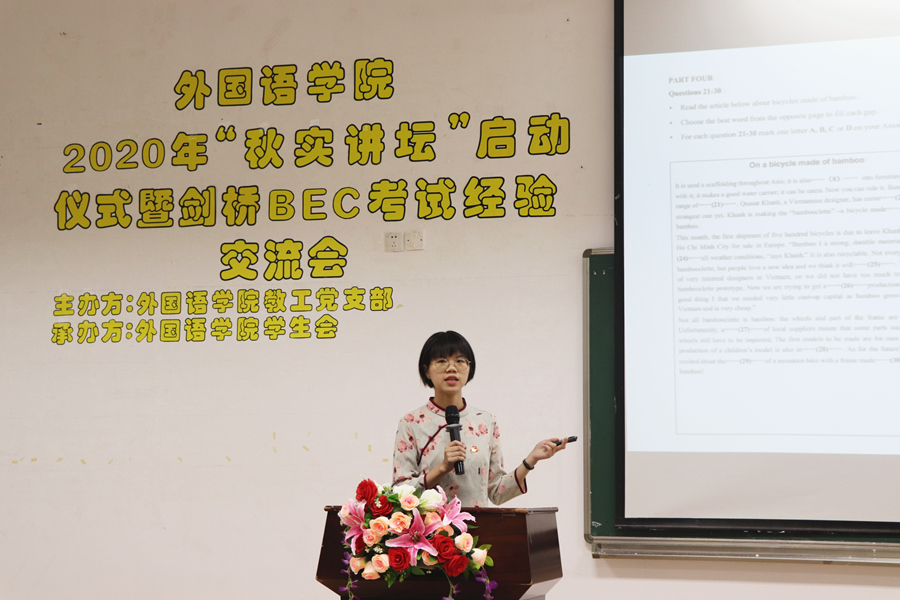接下来是剑桥BEC考试经验分享会,分享会以讲座的形式进行,由朱渺老师和梅之星老师分别介绍BEC中级和高级考试信息及备考经验。朱渺就BEC中级考试对大家做出全面的分析和解释,从考试顺序、考试时间、考试题型等方面,为在座的同学们打开了BEC考试之门。朱老师提出了明确的备考计划并建议同学们以搭档的形式进行口语练习。梅之星向同学们分享BEC高级考试的内容。她分析了BEC高级考证对未来求职的作用并从“阅读、写作、听力、口语”四个方面详细分析了各类题型的解答技巧及注意事项。梅老师提醒考生要早备资料,做好计划,真题为主,各个击破,做到扫盲+量变+质变。在问答环节,在场同学从BEC考试口语和词汇要求的角度向老师提出疑问。朱渺强调口语的训练应该是长期学习的习惯,不要一开始就不敢张口说,多读出语感,多读出成绩。梅之星则认为字典是最适合学习词汇的工具,她建议同学们对陌生单词进行标记,并按照计划及时复习,加深对单词的印象。