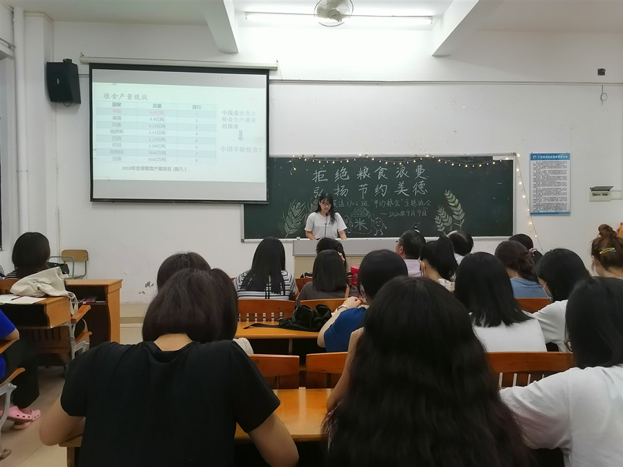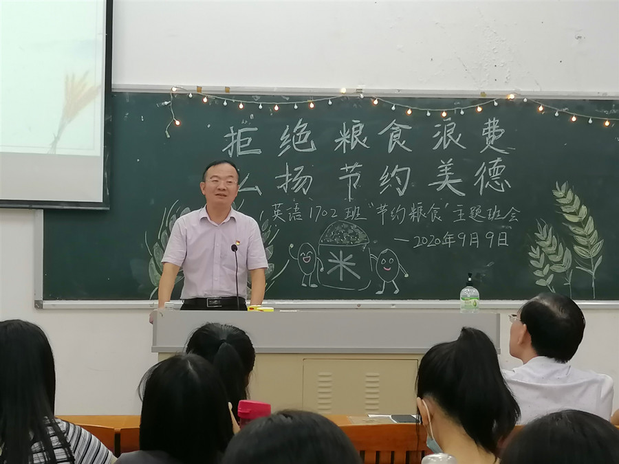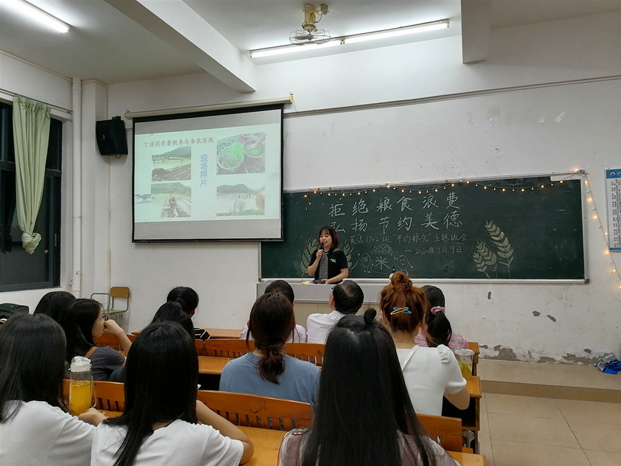 为响应党中央关于制止餐饮浪费行为的重要指示精神,大力弘扬中华民族勤俭节约的传统美德,加强班级学生爱粮节粮的忧患意识,十大网投平台排行17级英语专业2班于9月9日晚在四教110开展了以“拒绝粮食浪费,弘扬节约美德”为主题的班会活动。班级结对子老师黄弢校长、学院党总支书记徐超、班主任石佳、17级辅导员刘丽出席现场,班会由班长林晓莉主持。