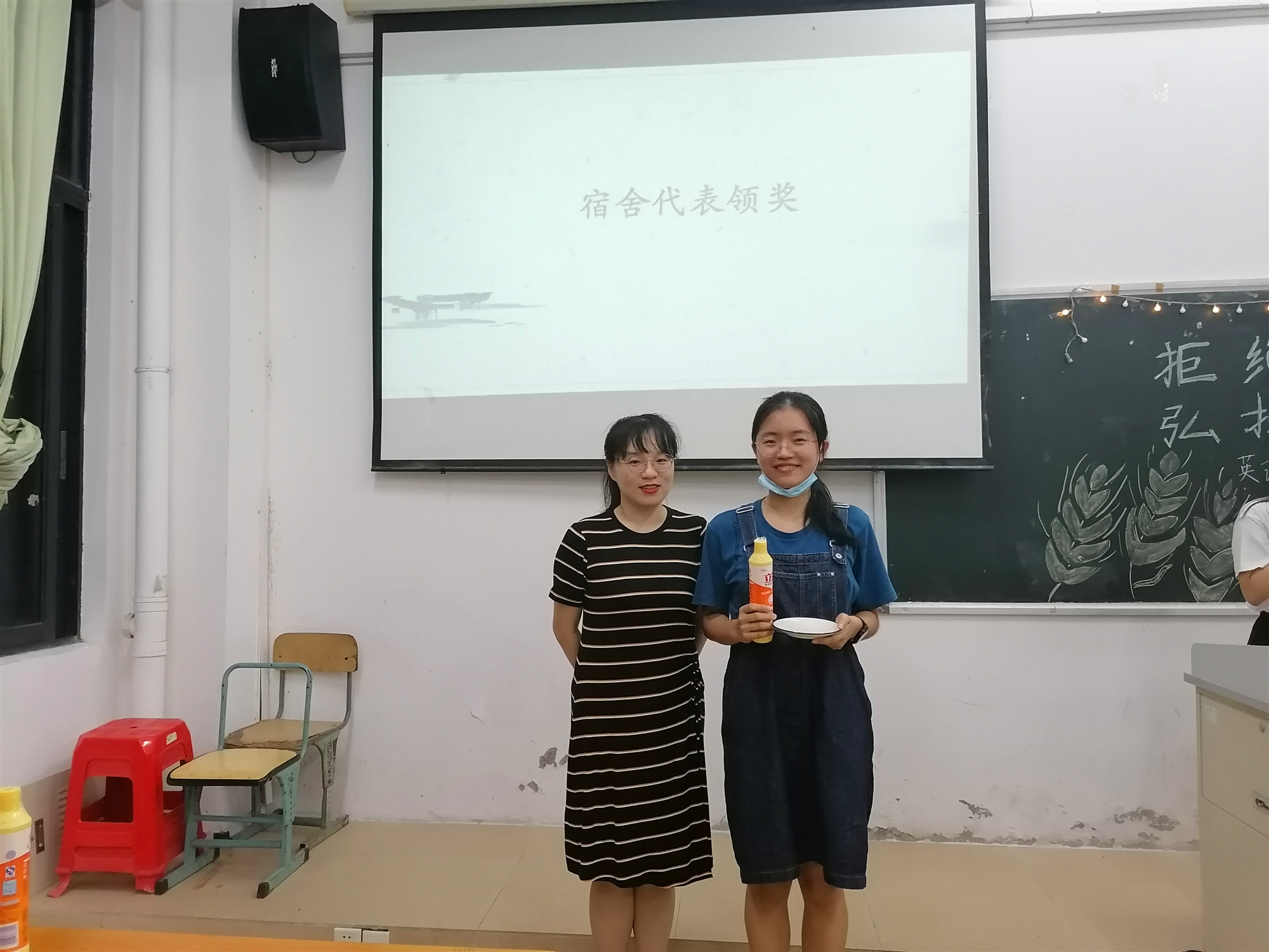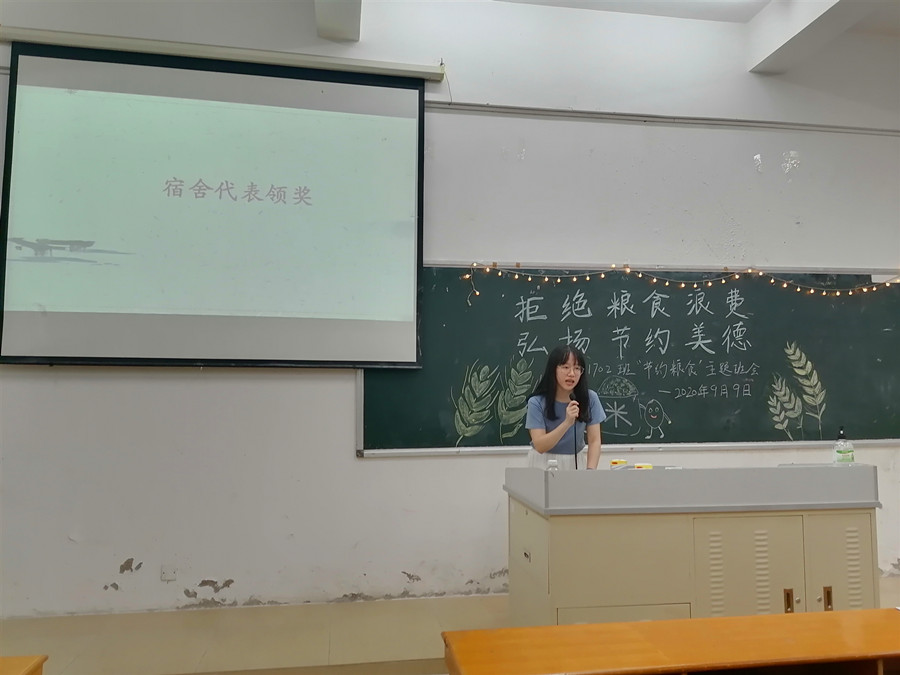 此次主题班会从观看粮食生产过程的视频为引,让同学们了解了粮食从播种到收获过程的艰辛和不易,体悟出“粒粒皆辛苦”所表达的深刻含义。紧接着,丁洁同学以自身经历为例讲述了她暑期务农体验的故事,并分享了她在农耕实践中感悟:饮食当不忘耕作之辛劳,应以简约回报之。班长林晓莉随之介绍了国家的粮食现状,一组组触目惊心的数据无不反映着我国粮食安全所面临的险峻问题,更呼吁着每一个公民应提高爱惜粮食的意识。在林晓莉同学的带领下,班级全体成员齐声宣读承诺书,承诺积极行动,争当“光盘行动”的示范者。班会在班级“光盘打卡”展示中进入尾声,并由到场嘉宾为参与打卡活动的优秀宿舍颁发了奖项。