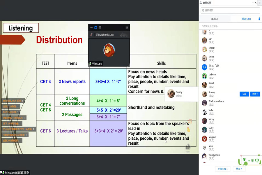 在本次交流会上,李卓华首先介绍了大学英语四六级考试的题型和特点,然后针对听力和阅读两种题型各个部分的出题重点、难点详细讲解了相应的答题技巧、备考策略。李卓华认为,听力是大学英语课程的重要基本功,着重介绍了精听训练的有关方法,为同学们切实提高听力水平提供了新的途径;而词汇是提高阅读能力的基础,着重强调了扩大词汇量的有关技巧,为同学们在记忆单词过程中开拓了新的渠道。在现场的问答环节,主讲老师和学生嘉宾与参加交流会的同学们互动交流,耐心仔细地解答了同学们的在线问题,为同学们答疑解惑,取得很好的反响。