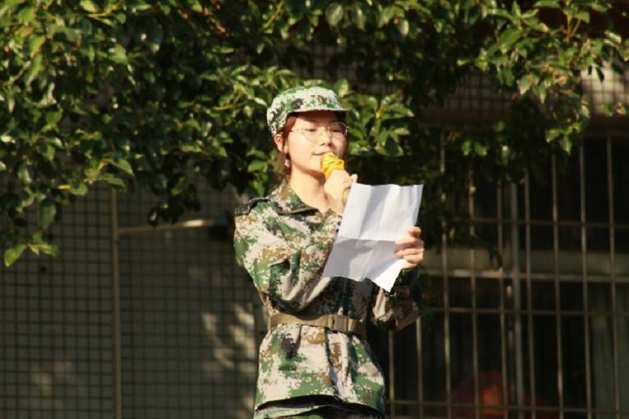 学生代表何泓进行发言,她承诺坚决听从教官的指挥,以军人的标准严格要求自己,发扬“不怕苦、不怕累”的精神,争当军训积极分子,争创军训先进连队。