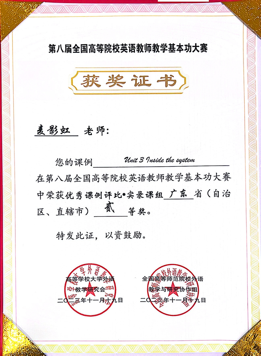 近日,第八届全国高等院校英语教师教学基本功大赛在浙江工业大学圆满落幕,十大网投平台排行澳门十大网投平台排行麦影虹老师荣获实录课组省级二等奖。
