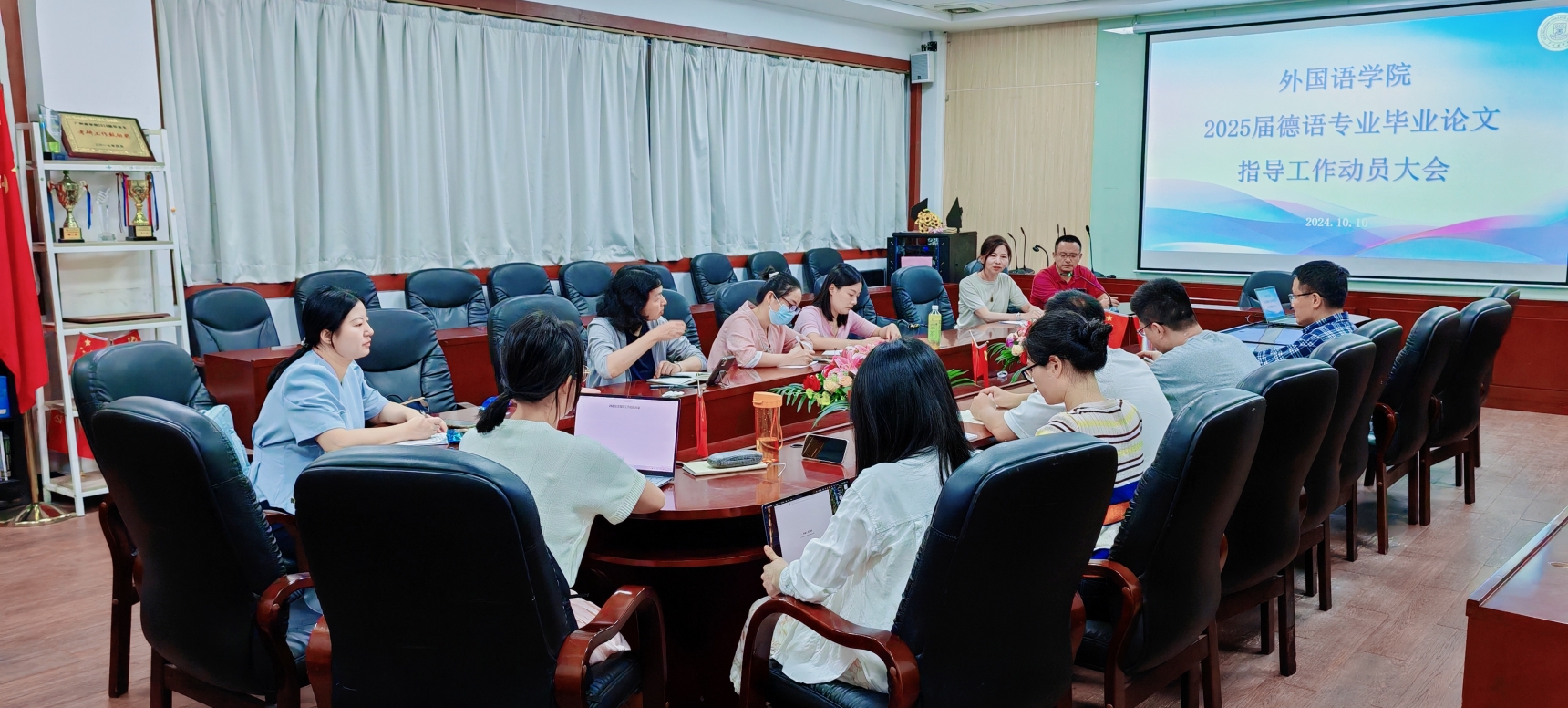 10月10日,澳门十大网投平台排行德语系召开2025届德语专业毕业论文指导工作动员大会。会议由德语系系主任周昳旸召集并主持,澳门十大网投平台排行副院长袁鑫发表讲话,专业负责人潘艳博士及全体德语专任教师共同出席,旨在为即将到来的毕业论文指导工作做好充分的准备。