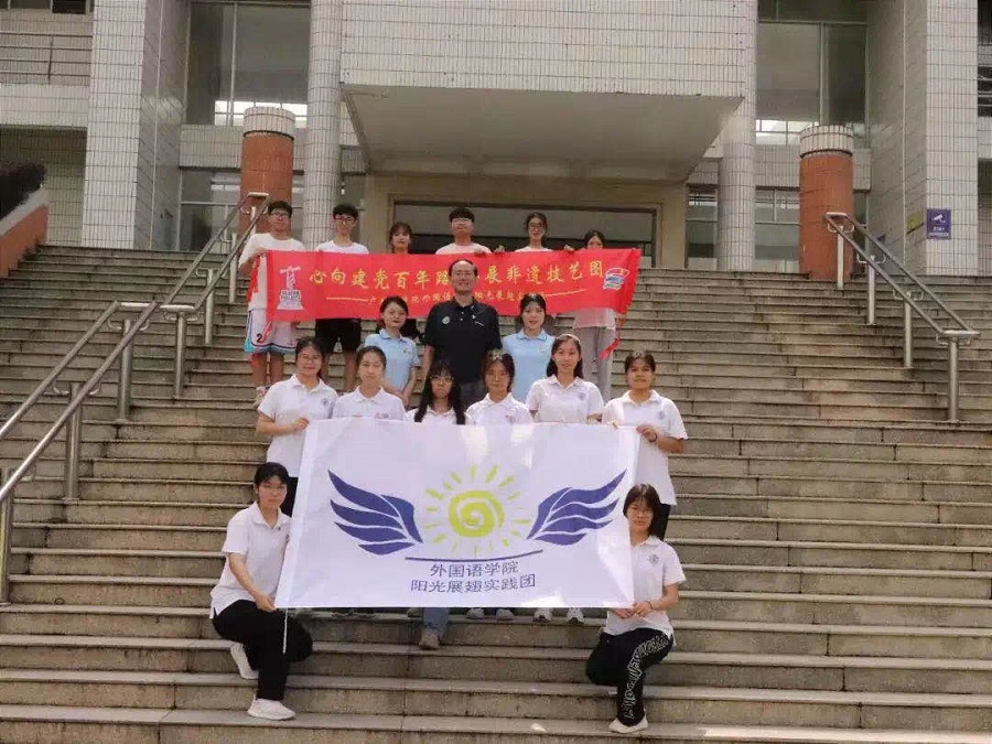 2021年7月16日,澳门十大网投平台排行阳光展翅实践团在第一教学楼前举行了以“心向建党百年路,共展非遗技艺图”为主题的2021年暑期“三下乡”社会实践活动启动仪式。出席本次启动仪式的有澳门十大网投平台排行党总支书记徐超,澳门十大网投平台排行阳光展翅实践团指导老师蔡文蝶、谢清玲及阳光展翅实践团全体成员。