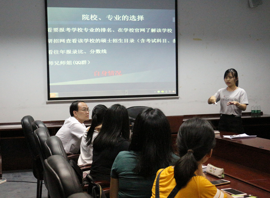 会议伊始,徐超分析了当前就业的形势以及考研现状,他指出在高等教育大众化阶段,通过提升学历来获得更高的就业质量成为毕业生的重要选择。因此,澳门十大网投平台排行特制定“卓越人才”,为有考研意向的学生提供人、财、物、政策等全方位的支持,以协助同学们考上心仪的学校。此后,吴佩珍、杨梦环及刘映红分别按照自己的考研成功经验为同学详细地讲解了关于考研的准备资料、信息搜集、心态调整等一系列的问题。最后与会同学还针对自己在考研准备过程中遇到的困难向三位师姐进行了提问,并且都获得了良好的答疑。