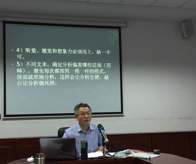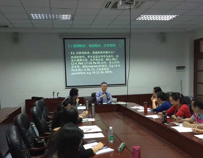Portrait of An Actress’里面的具体例子给老师具体演示。王教授指出在分析中要从不同的角度出发来看文本中的种种语言现象,尽可能猜测作者的写作意图,同时要注意文本的张力,在文本中寻找解读的线索,或“路牌”,才能使文本解读更加专业和客观。第二部分,在座的老师们就文本理解和文本细读的方法与王教授进行交流。
