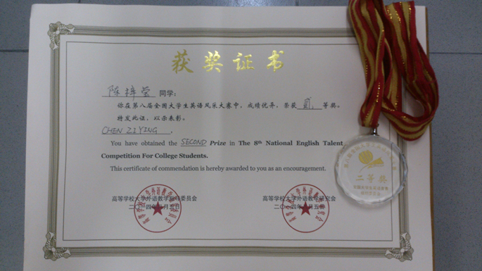 日前,2014年全国大学生英语竞赛(NECCS)全国总决赛暨2014年全国大学生英语夏令营在沈阳东北大学落下帷幕,我系2011级德语专业的陈梓莹同学作为广东省选拔的7位选手之一(唯一的民办高校学生),不负众望,凭借流利的口语和精彩的表现在演讲赛和风采大赛中脱颖而出,获得第十五届全国大学生英语演讲比赛优秀奖、第八届全国大学生英语风采大赛二等奖,为广东省和学院赢得了荣誉。