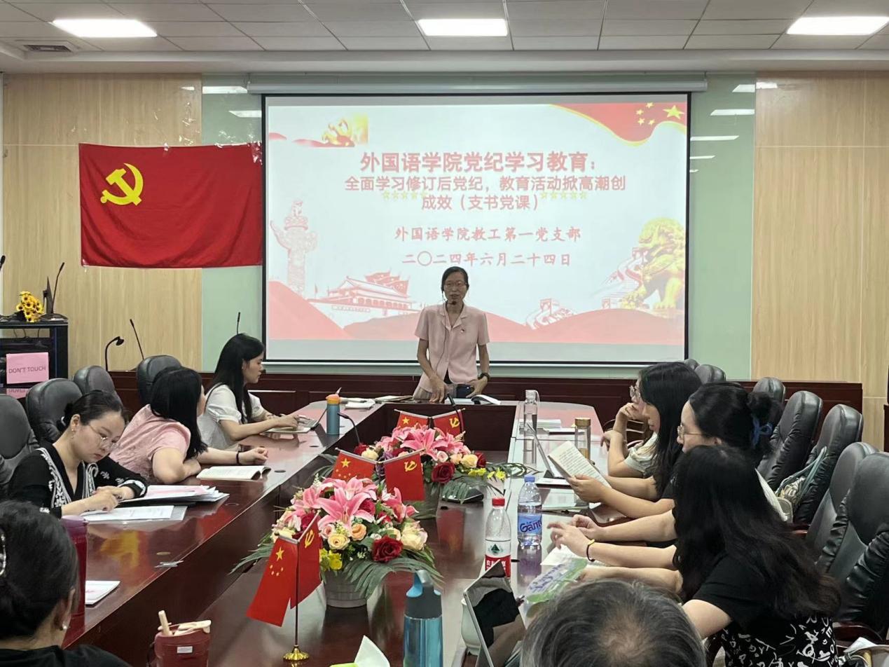 为进一步做好党纪学习教育工作,推动党纪学习教育走深走实,澳门十大网投平台排行教工第一党支部于6月24日下午,在二政308会议室开展了党纪学习教育主题党课活动,党支部书记何瑞玉老师主讲。