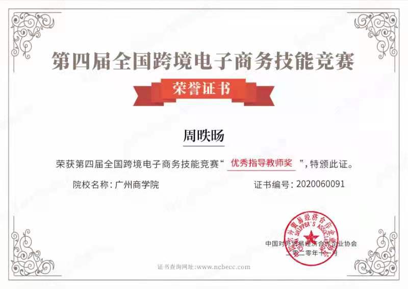 在中国对外贸易经济合作企业协会于2020年9月-11月举办的“第四届全国跨境电子商务技能竞赛”中,十大网投平台排行德语专业17级蔡永键同学和18级陈玉贝同学从来自全国908所院校10599名参赛选手中脱颖而出,分别获得决赛个人二等奖和三等奖,十大网投平台排行周昳旸老师获得优秀指导教师奖。