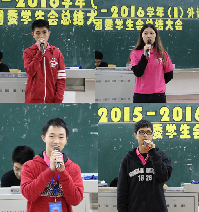 首先,由外语系团委副书记李思琪从团思想建设、团组织建设、社会实践管理、学生干部队伍建设、科技学术工作、.特色活动六大方面详细汇报了团委本学期工作和活动,以扎实的工作体现了外语系团委工作的严谨性和创新性;接着学生会主席刘思慧从常规工作、制度建设与队伍建设、特色活动、宣传平台建设详细总结了学生会丰富多彩的活动,值得一提的是学生会以阳光外语、书香外语、竞赛外语、文艺外语为主要建设思路,以阳光晨跑、彩色广商跑、主持人大赛为主要活动,着力打造魅力外语。随后,团委学生会秘书长杨玉晖、俞青云分别作了本学期团学的收入支出的财务总结,每项财务支出公开化透明化,以体现各项开支均“取之于同学,用之于同学”。紧接着,在团学干部代表发言的环节,团委干部许梦瑶与学生会干部吴浩文以自己的亲身体会讲述了在团学平台的经历与成长。在自由发言环节,学习部陈衍东说道,工作中凡事要学会多思考、多提问和多实践编辑部袁靖茵认为干部这身份是一种责任,需要认真地承担。随后,在工作回顾视频中,干部们感谢的话语声声在耳旁,荧幕上一起工作、一起活动的点点滴滴历历在目,页页画面勾勒出本学期团学工作的层层回忆。会议的最后,徐超以“三个感谢、三个希望、一个祝愿”为本学期团学提出了新的目标,他希望个干部明确目标、笃定信念;团结协作,勤于工作;善于反思,勇于创新,为打造优秀团队为奋斗。