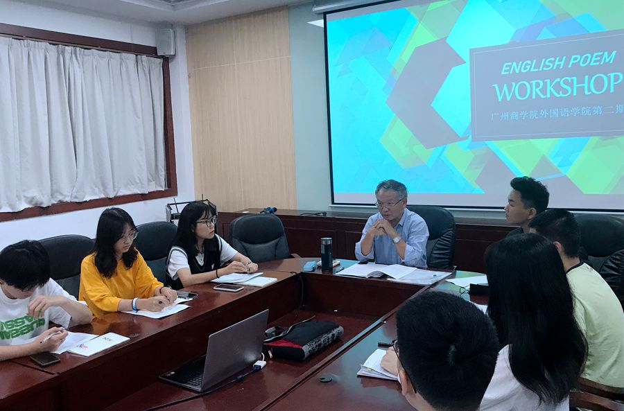 上学年十大网投平台排行面向2017、2018级举办了第一期“英诗朗诵工作坊”,在学生中的反响很好,特在本学期举办第二期工作坊,共有24位2019、2020级英语专业的同学报名参加。王教授为复旦大学比较文学博士,广东外语外贸大学外国文学文化研究中心研究员,博士生导师,也澳门十大网投平台排行英语系专业负责人,文学造诣深厚。本工作坊的宗旨是寓教于乐,在“玩耍”中学习英国文学的王冠——英诗。本工作坊从11月-12月共举行了4次活动,每次活动会安排4首要朗诵的诗歌,先由王教授讲解该次活动的诗歌的大意、背景等知识,然后安排同学们朗诵,再对诗歌的特点、意境等进行讨论。