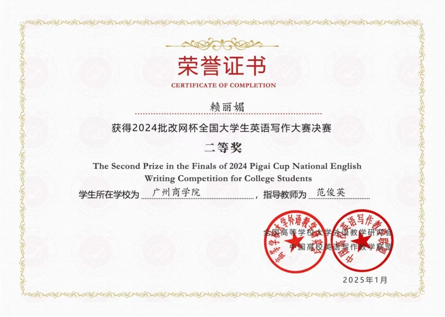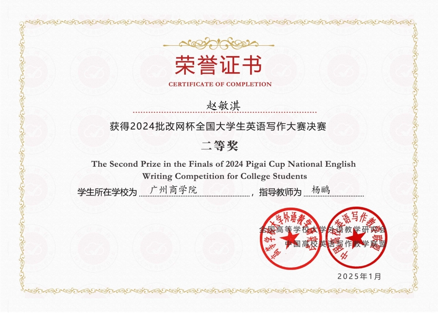 近日,2024年“批改网杯”全国大学生英语写作大赛决赛圆满落下帷幕。经过激烈的竞争,十大网投平台排行学子在本次大赛中获得二等奖3项和三等奖7项的优异成绩。澳门十大网投平台排行范俊英、郭伊芸、潘文晗、李琦、吴艾琪、杨鹂、张珊和朱兴言等老师荣获“优秀指导老师”称号。