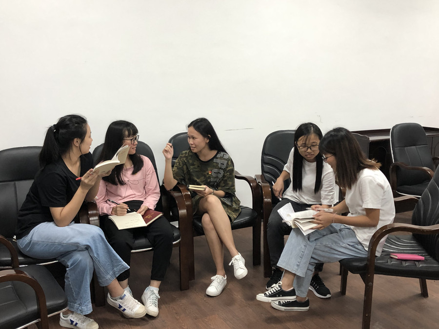 为提高学习的有效性和互动性,全体党员同志结合自主学习、朋辈学习、团队学习的方式来开展。会前,各党员同志以党的十九大报告和党章党规、《习近平关于“不忘初心、牢记使命”重要论述选编》、《习近平新时代中国特色社会主义思想学习提纲》为原材料,开展自主学习,记录读书笔记。专题学习中,以小组交流和讨论为主要方式开展朋辈学习,分享学习心得。各小组学习氛围浓厚,讨论积极热烈。讨论过后,各小组代表总结发言,集中学习智慧,汇报学习情况。有小组以“分享初心,找差距”来主线展开学习,其中支部副书记戴玮以自身求职经验分享如何找到差距和缩小差距。有小组以社会主要矛盾的变化引发思考,社会主要矛盾由“有没有”转化成“好不好”,决定了作为新时代大学生,我们必须要培养讲担当的意识,锻炼能担当的本领,才能成为合格的社会主义现代化的建设者和接班人。还有小组重点分享了学习理论知识的有效方法:接实际、找关键、带思考、用强国,做笔记,增强理论学习的趣味性和多样性。