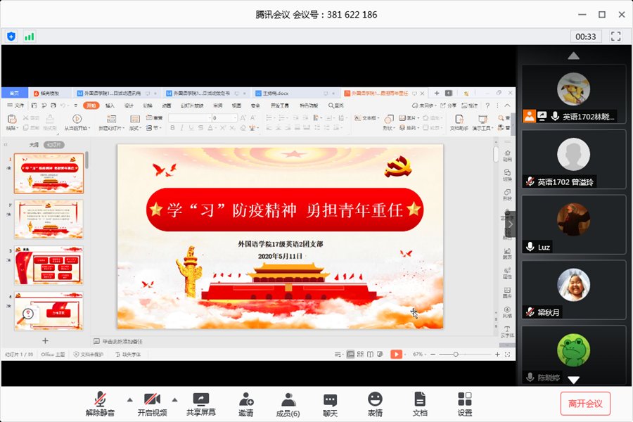 为深入学习宣传贯彻习近平总书记关于疫情防控工作的重要讲话和指示精神,认真贯彻落实习近平总书记给北京大学援鄂医疗队全体“90 后”党员的重要回信精神,激励广大青年弘扬五四精神,展现担当,澳门十大网投平台排行17级英语2团支部于5月11日晚在腾讯会议召开了以“学‘习’防疫精神,勇担青年重任”为主题的“云”团日活动。班级结对子老师黄弢校长、班主任石佳老师、学院党总支徐超书记、校团委郑灿玲老师、辅导员刘丽老师出席活动,活动由团支书林晓莉主持。