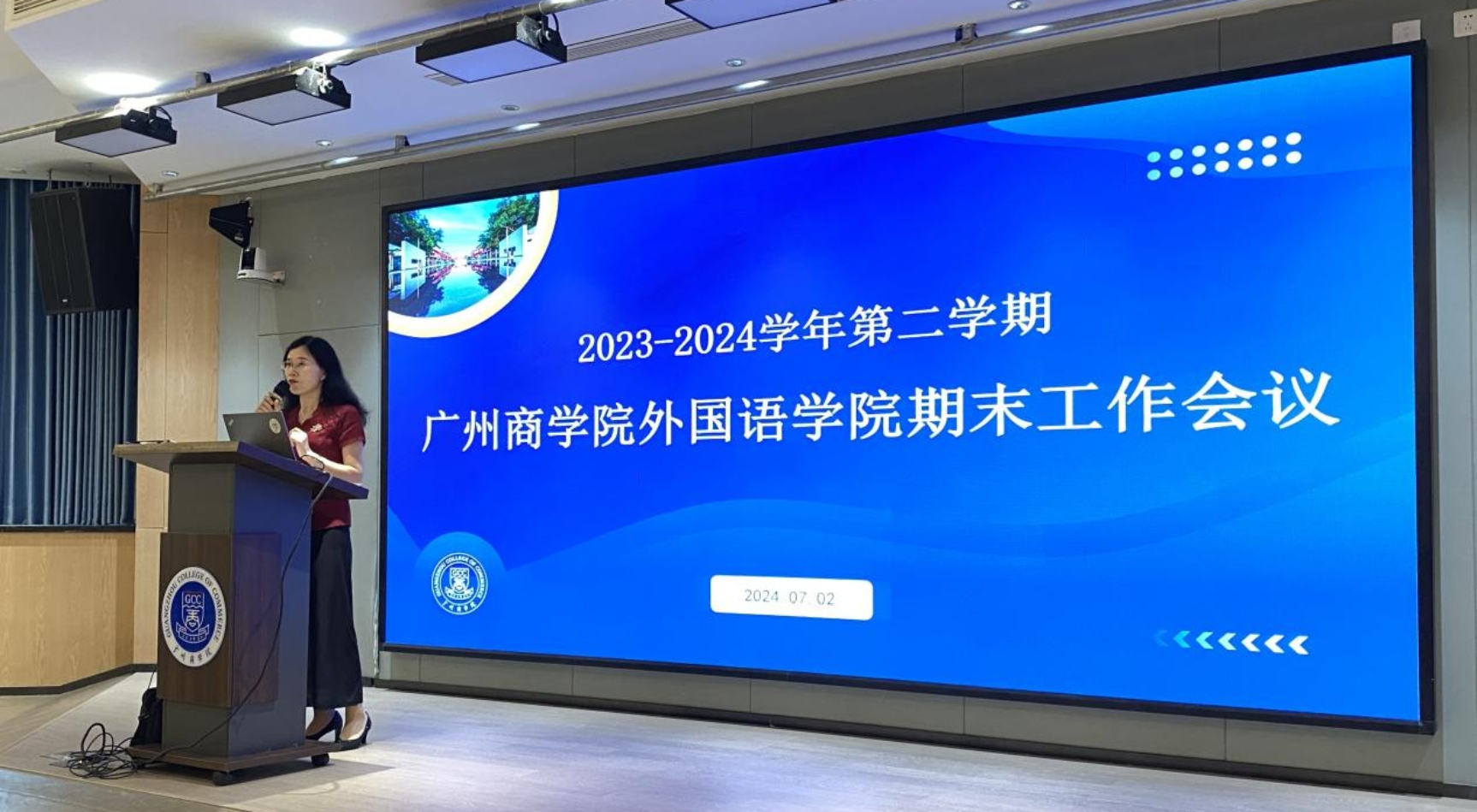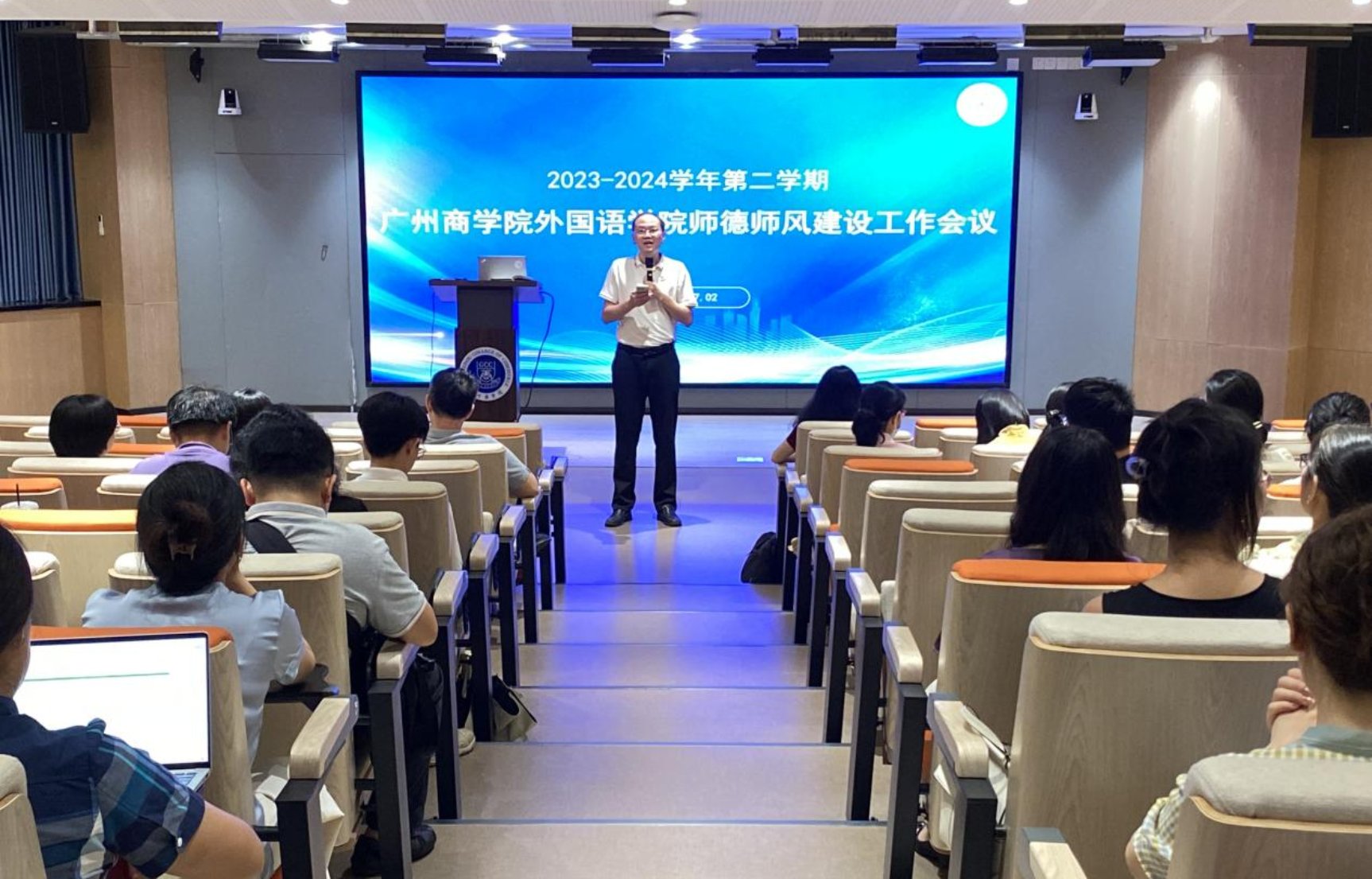 郭遂红分享了教师教学比赛、一流课程建设的经验和成功案例,通过学生学科竞赛的案例,鼓励老师们在课堂上多方面启发,引导学生提升综合能力。最后,郭遂红带领全体教职工跟随学院“大事记”的记录回顾了学院 2024上半年开展的各项工作、取得的各项成果,对勤劳、踏实在各个岗位上工作的老师们予以感谢和肯定。