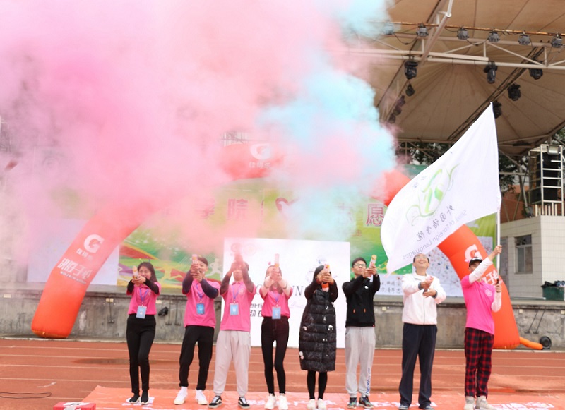 在热烈的掌声中,徐超与领跑学生代表进行院旗交接仪式。伴随彩色礼炮的响起,彩跑正式开跑。同学们依次冲过了起跑线,快乐地向前奔跑,共同领略四季的变换。