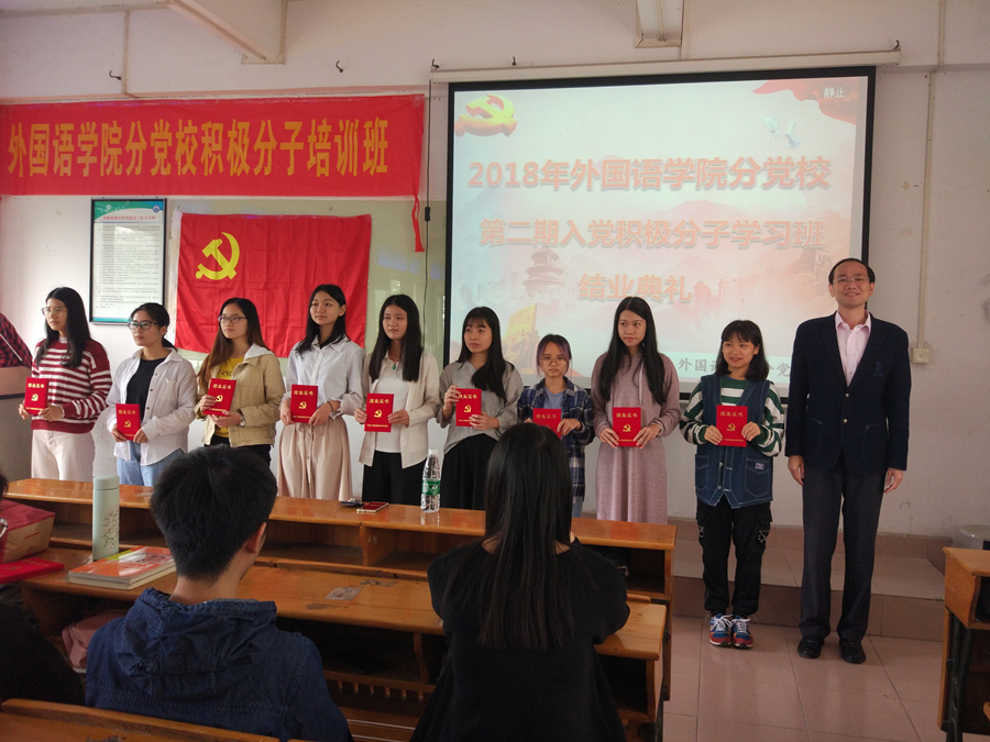 徐超肯定了本期入党积极分子学习班教育活动的重要意义,并指出了学员们在学习中的不足,督促学员们在今后的学习需要更加的努力,弘扬党的优良作风,严于律己。接着他对结业学员提出三个希望:一是希望各位学员继续加强学习党的基本理论学习,包括继续学习新的党章和新的表述、继续学习经典的理论与著作、继续学习习近平总书记的最新理论、继续学习国内外的形式与政策。二是希望各位学员加强外语专业的学习,做到学以致用。三是希望各位学员加强构建人际能力,做到联系党员和群众,并且强调,全体学员们要发挥自己的模范作用。