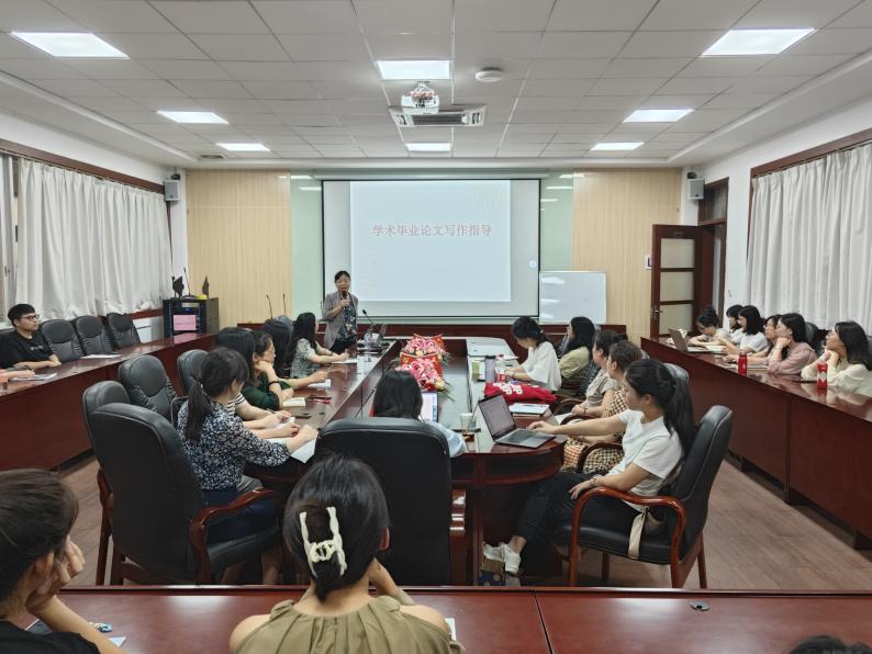 戴桂玉就英语专业毕业生论文选题和开题报告的撰写做了详细讲解,主要内容包括:论文选题的基本要求(明确理论视角和研究对象、确定研究焦点、紧跟国家重大战略规划和研究前沿、树立创新意识)和研究计划书的撰写细则(主要包括研究背景、研究目的与研究问题、研究意义、文献综述、研究方法等部分)。戴教授以自己指导过的学生毕业论文为案例,具体分析论文写作中的关键环节和注意事项,为与会教师提供了明确的论文指导方向。她总结道,毕业论文一定要体现问题意识,论文各个环节之间必须逻辑严谨、环环相扣,论证充分。